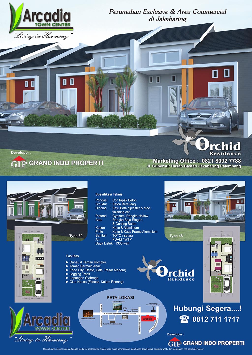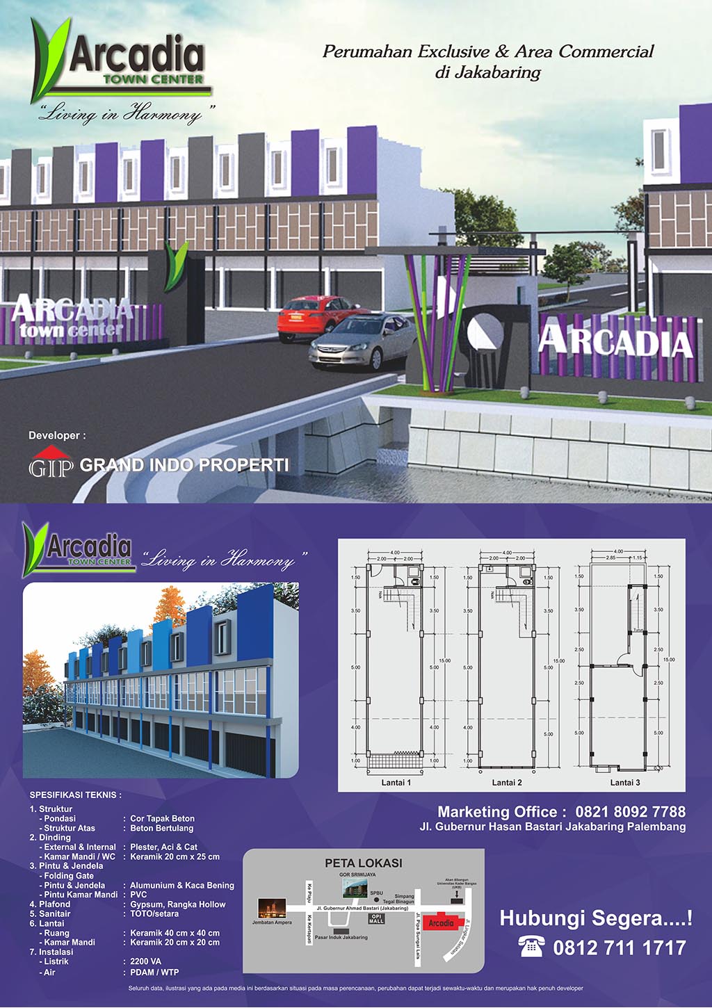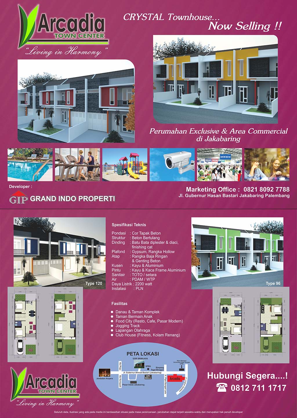 Arcadia Town Center hadir di Jakabaring, menawarkan konsep Green Living dan Exclusive Lifestyle. Dikembangkan oleh Grand Indo Properti, Arcadia Town Center juga merupakan jaminan investasi yang berharga karena mengusung konsep hunian harmonis antara residensial dan komersial. Sarana Club House (fitness, kolam renang, gedung serbaguna), jogging track, playground, 24 hours security, food city, taman-taman dan danau buatan menciptakan suasana lifestyle yang lengkap dan nyaman.